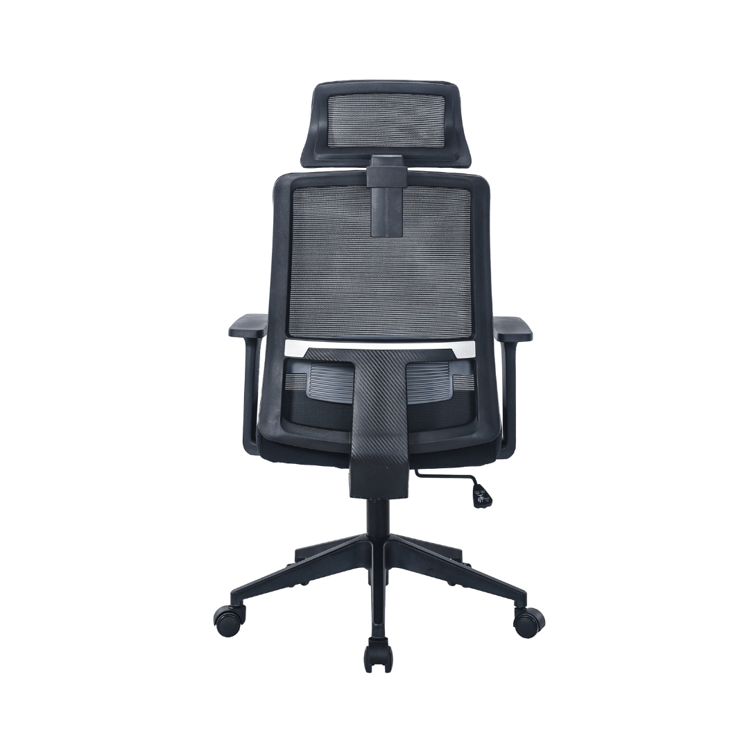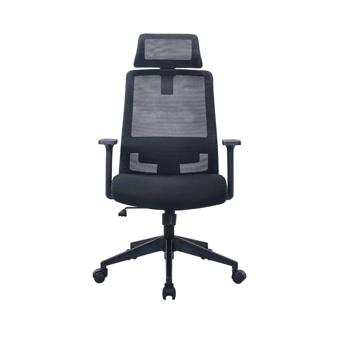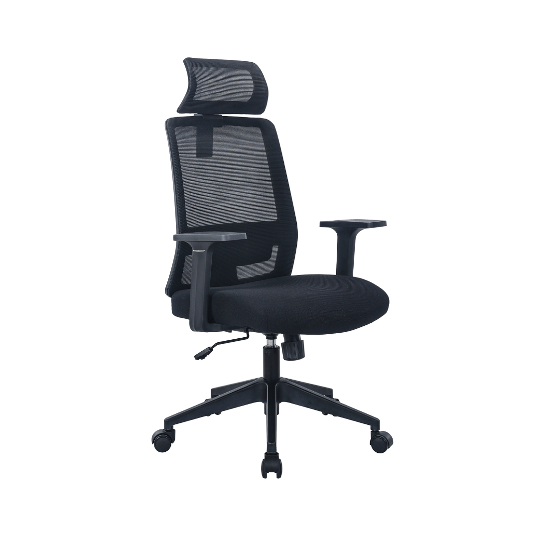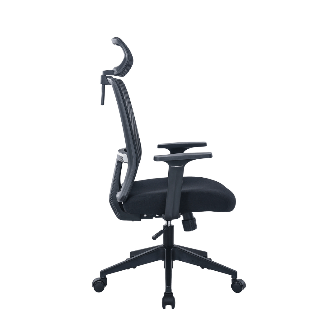 כסא מנהלים גבוה בעיצוב מודרני עם ריפוד בד שחור וגב רשת אלסטי.