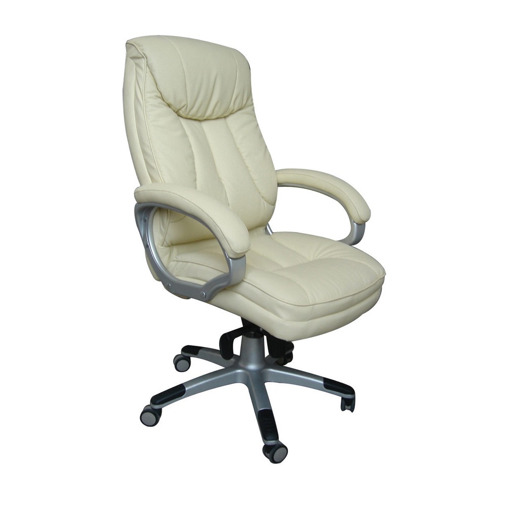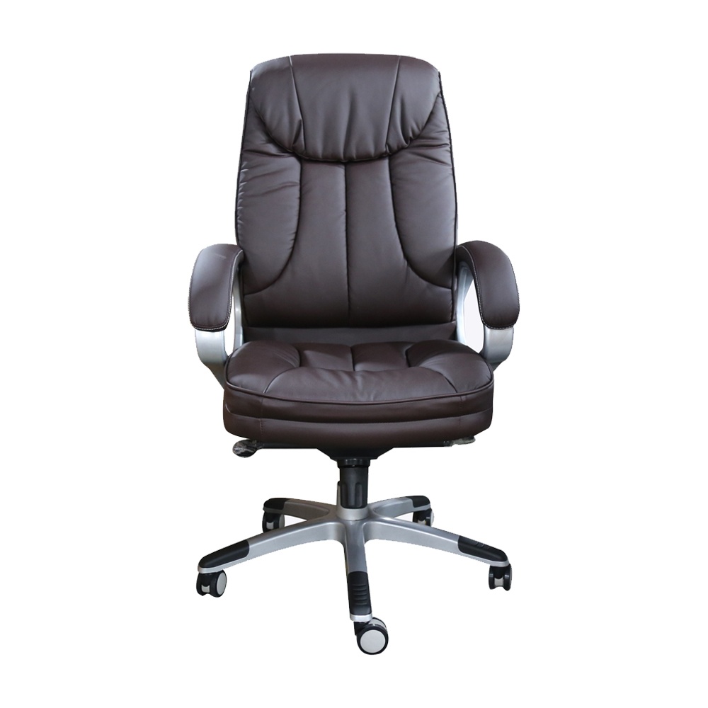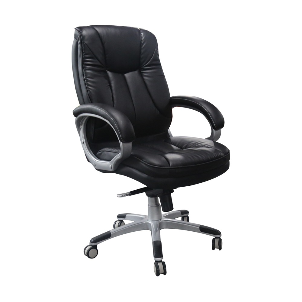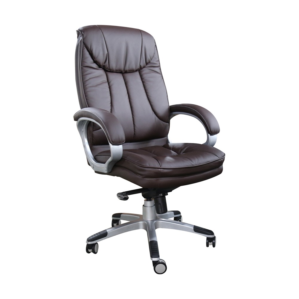 העיצוב האלגנטי של כסא מנהלים דגם סאב גבוה דמוי עור כולל בסיס מתכת בצבע כסף עם חמישה זרועות חזקות וגלגלים כפולים לניידות חלקה.