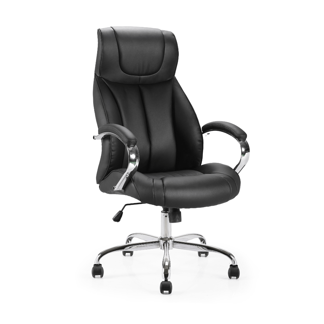 כסא מנהלים יוקרתי בצבע שחור עם ריפוד דמוי עור איכותי, ידיות כרום ובסיס כרום חזק.